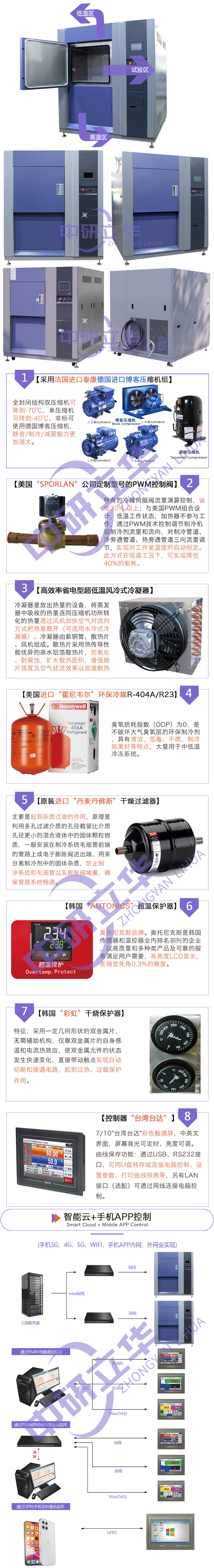 2、該試驗箱主要功能元器件均采用高端配置、技術原理可靠、 噪音與節能得到控制——其性能可與國外同類產品蓖美。