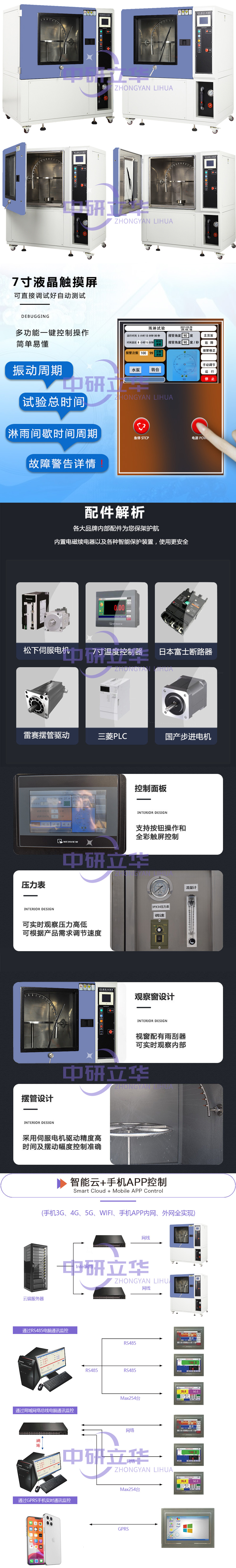 2.全儀表的控制系統以及變頻技術的采用,使得降雨量、試品架的回轉角度,噴水擺桿的擺動角度以及噴水量,擺動頻率都可自由設置及調節